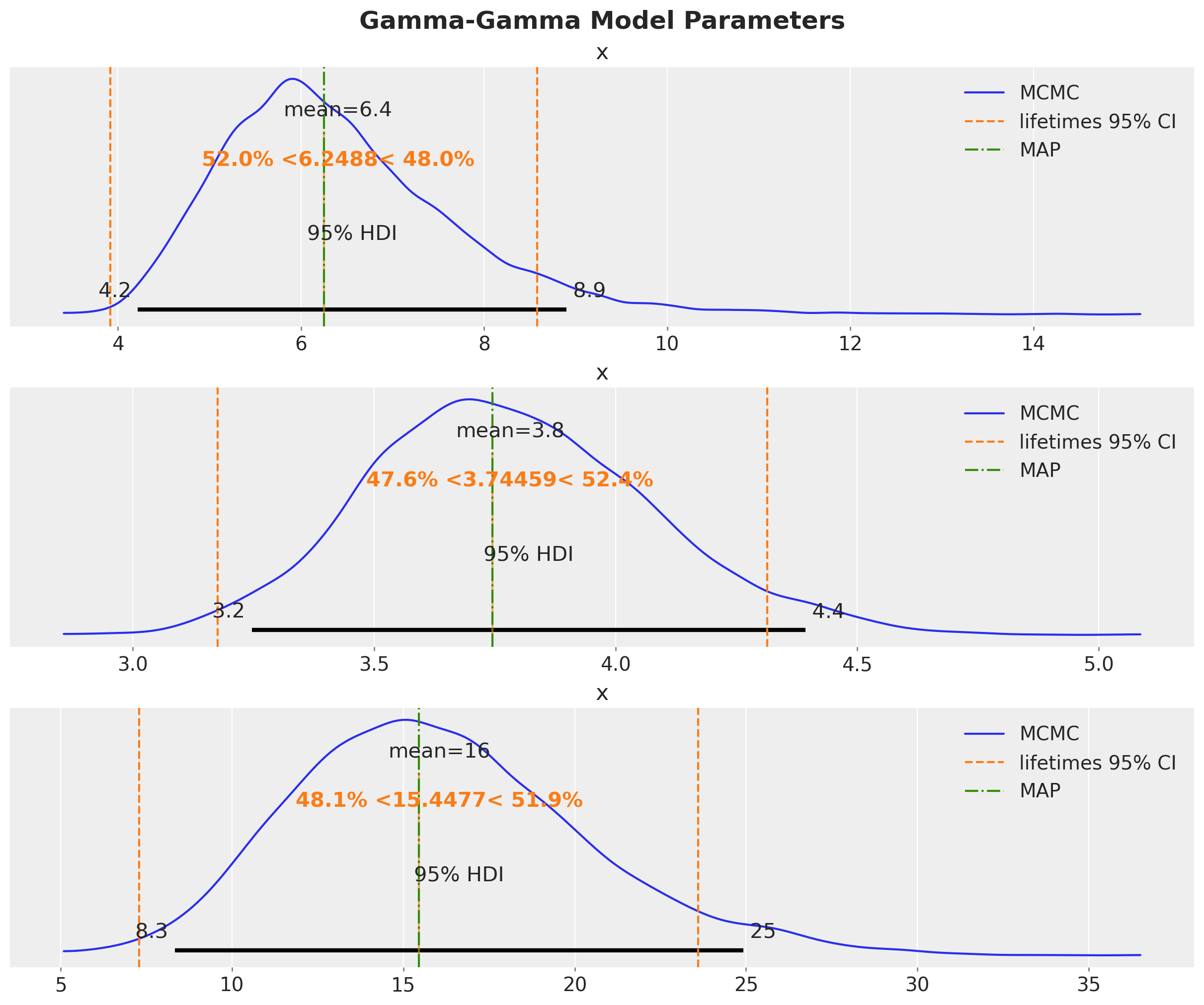 We can compare the results with the ones obtained by the lifetimes package and the MAP estimation.