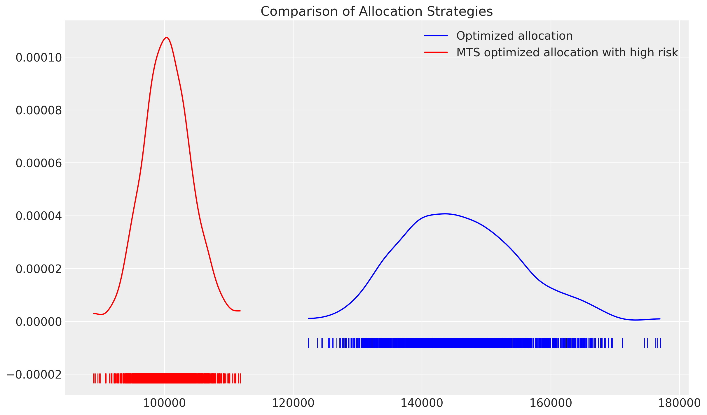 If you see this distribution, you’ll probably note it is similar to the initial unaware risk optimization. This is because, as alpha approximate to 1 your risk profile is high, and the optimization start to become closer to a simple mean(posterior).