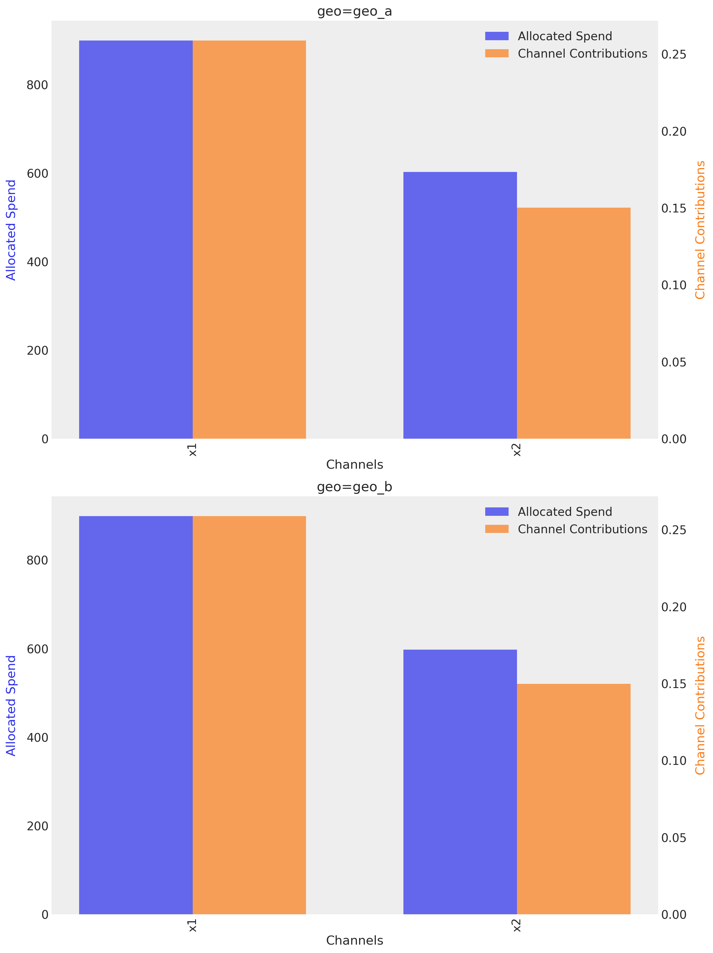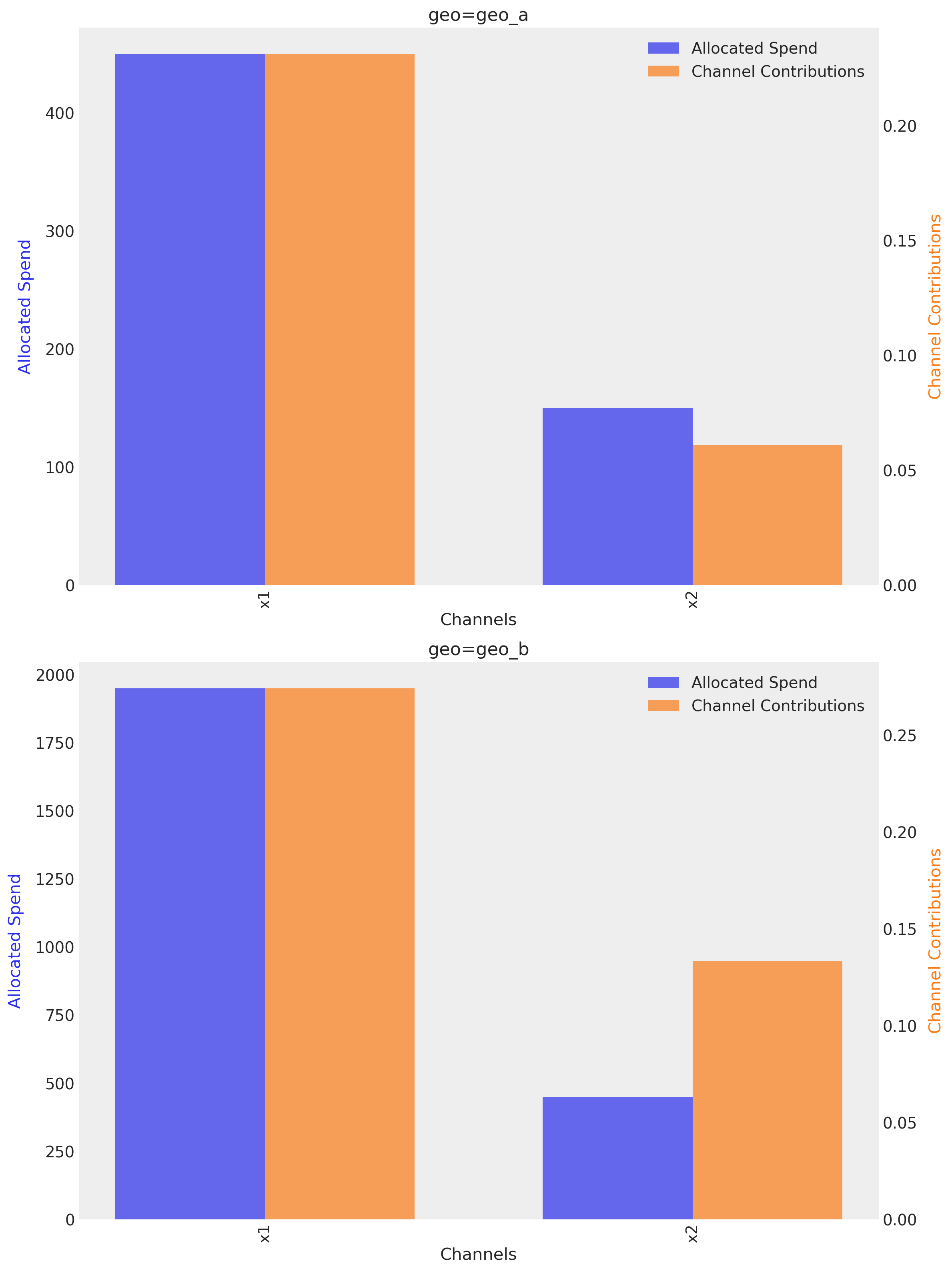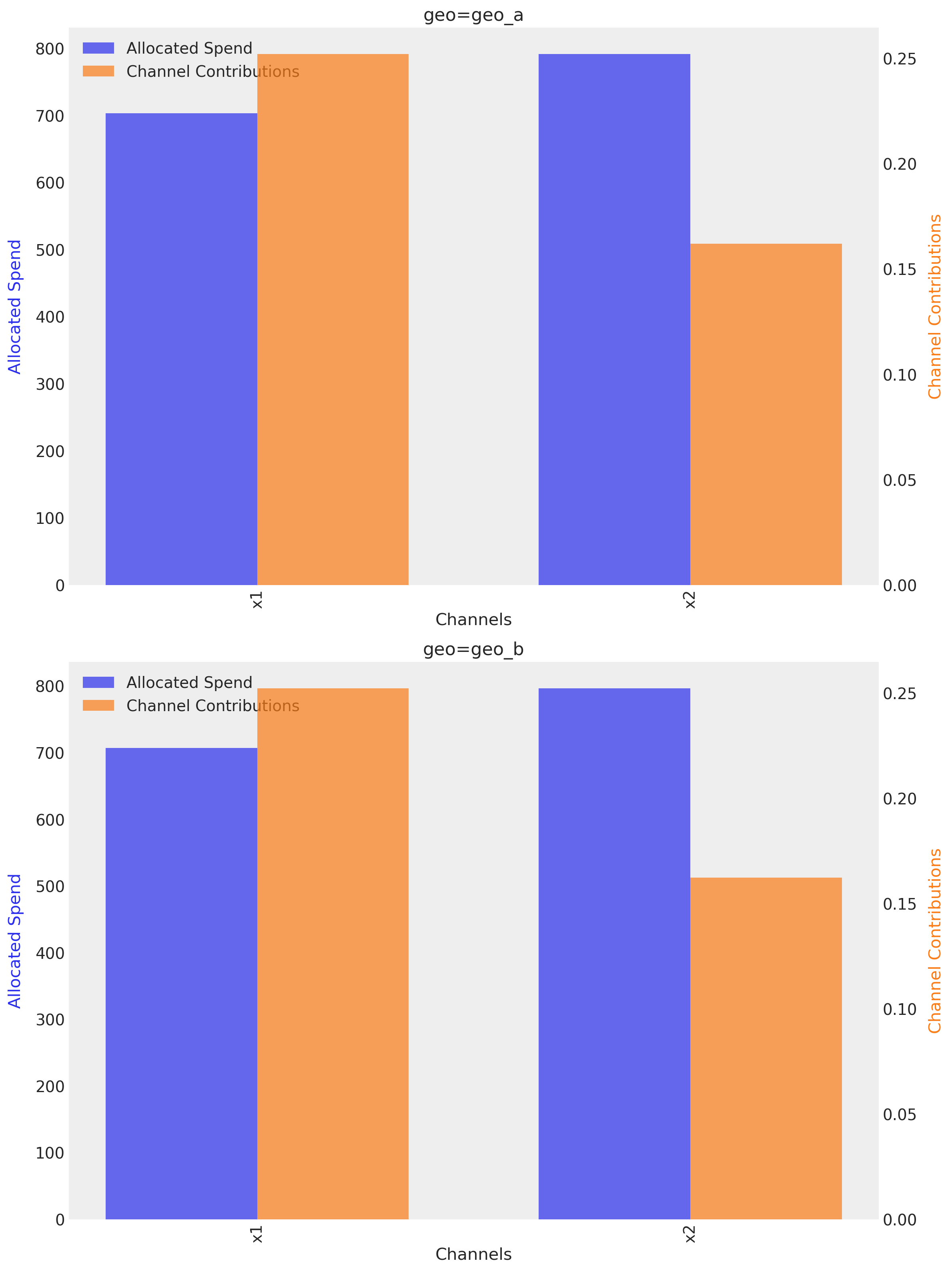Could we do better? The usual approach is to allocate the budget to maximize the response. We can use the optimize_budget method to do so, here we will compute the response given several budget combinations, and we’ll prefer the one that maximizes the response. It’s important to note that this example doesn’t use any bounds, or constraints, so the optimizer will seek to use the entire budget.