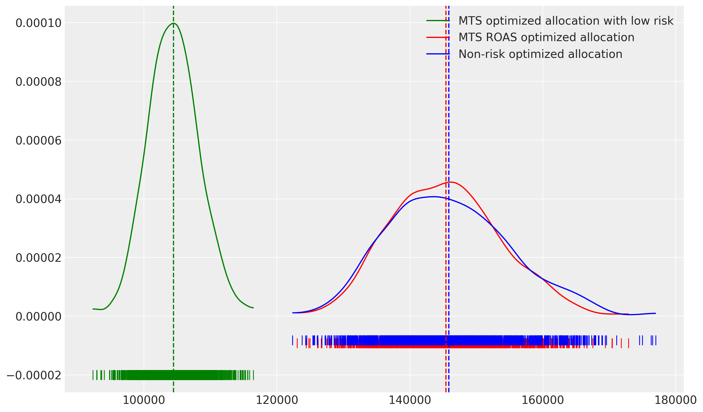 The optimizer is once again allocating the budget to \(X1\) majority, nevertheless \(X2\) it’s getting more money this time. However, this decision is informed by the expectation that the current combination will yield a higher Return on Advertising Spend (ROAS), while also presenting a small lower risk profile compared to the previous allocation.