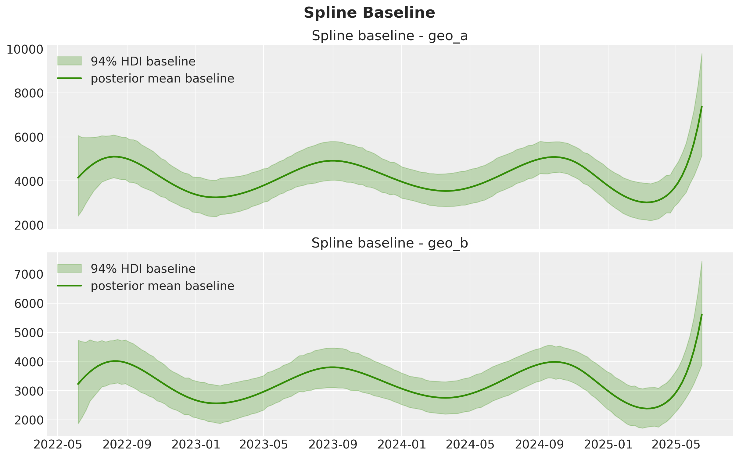 The spline term is our smooth baseline component. It captures persistent temporal variation that is not directly explained by media, controls, or seasonal Fourier terms.
