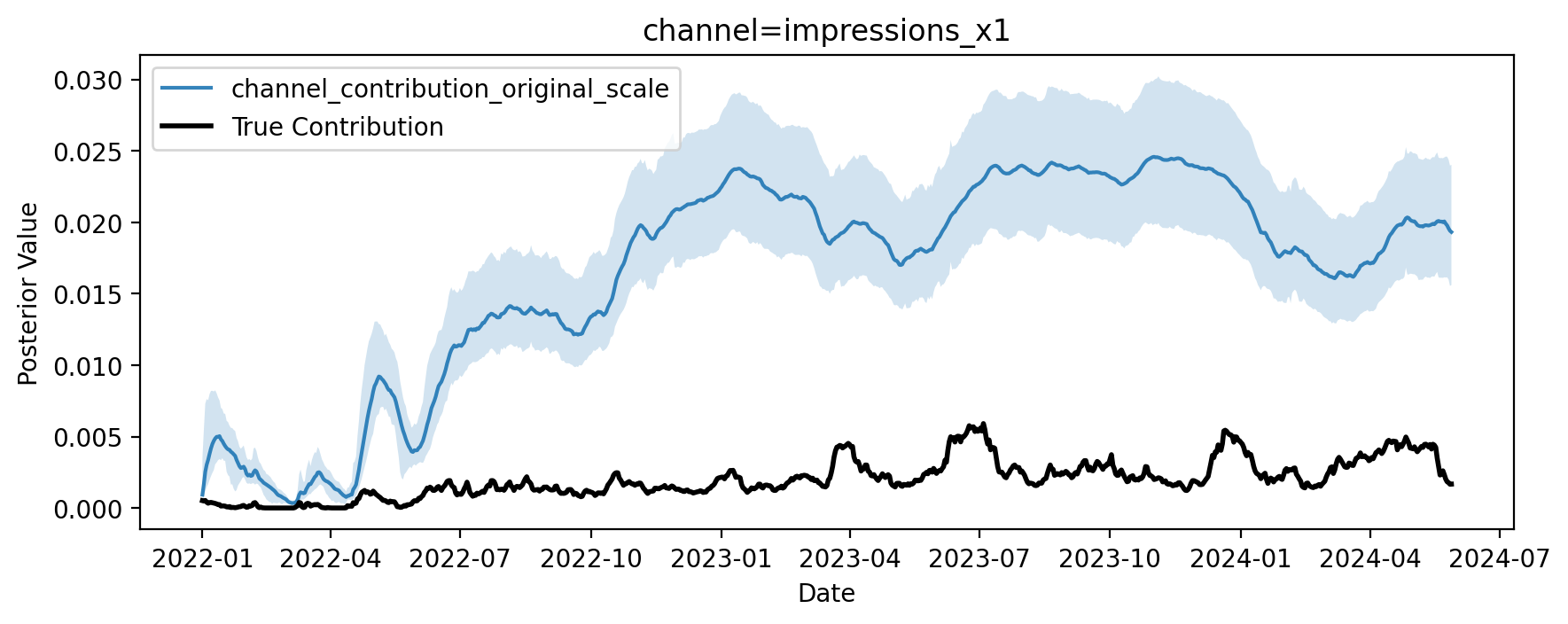 Great, we can see that the estimated contribution is very close to the true contribution in the in-sample period. We can do the same for the out-of-sample period, and using the out of sample period, we can check if we recovered the causal effect of \(X1\) on \(Y\).